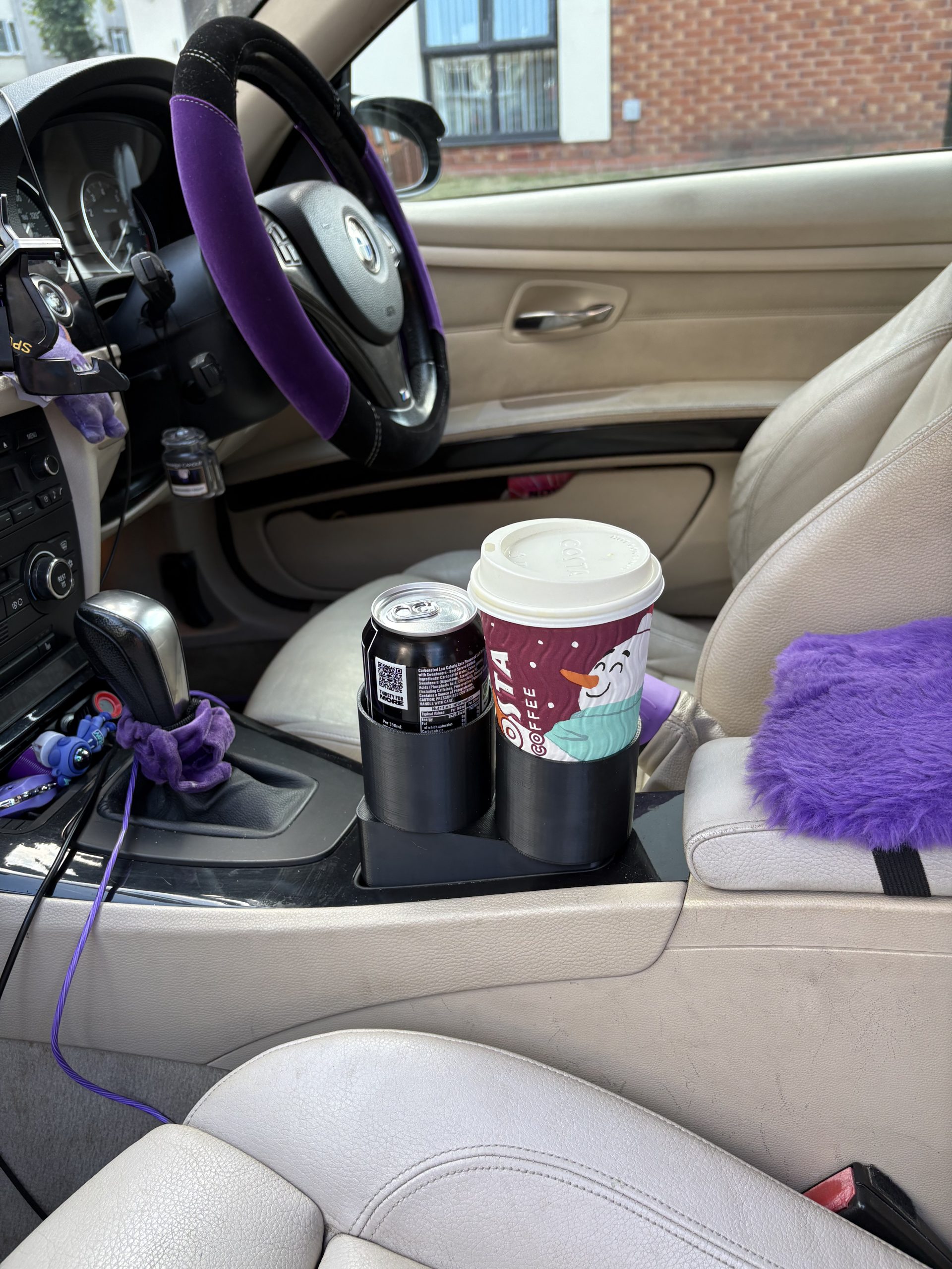 Dual cupholder for BMW E90 (2005–2012). Holds 2x 74mm cups. UK-made, heat-resistant ABS, OEM fit. Easy install, no tools required.
